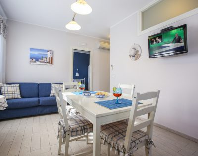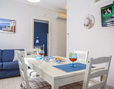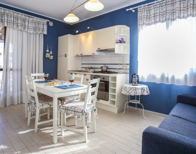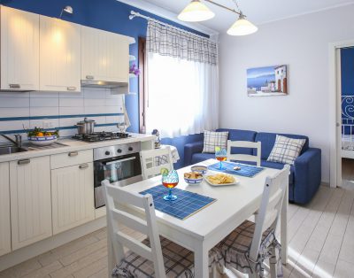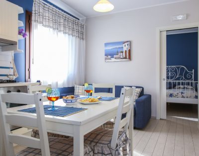 INSIDE : Può ospitare da 2 a 4 persone. Arredato in perfetto stile mediterraneo è il luogo ideale per chi vuole trascorrere le proprie vacanze al mare senza rinunciare al relax che offre la piscina. Il bilocale, dispone di cucina soggiorno con divano letto matrimoniale, una camere da letto matrimoniale e bagno con box doccia ed angolo lavanderia.